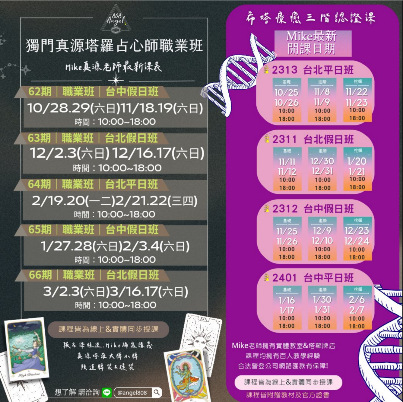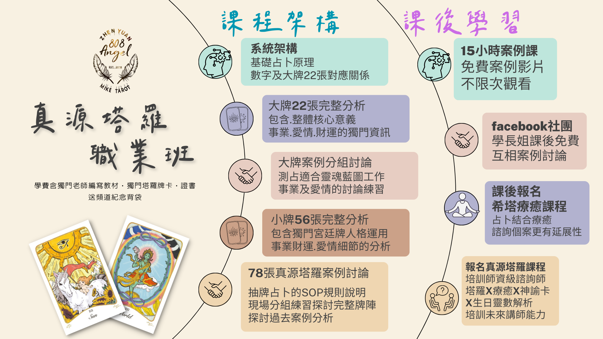 總時數 45 小時 :30 個小時【面授課】 + 贈送 15 小時案例【線下課】聽老師專業分析牌陣解讀 (價值2萬元)